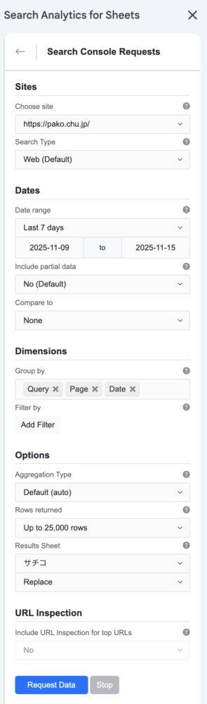 サチコは「読者がGoogle検索で、どうやってあなたのブログを見つけたか」を見る場所です。AIには以下のCSVデータを渡します。