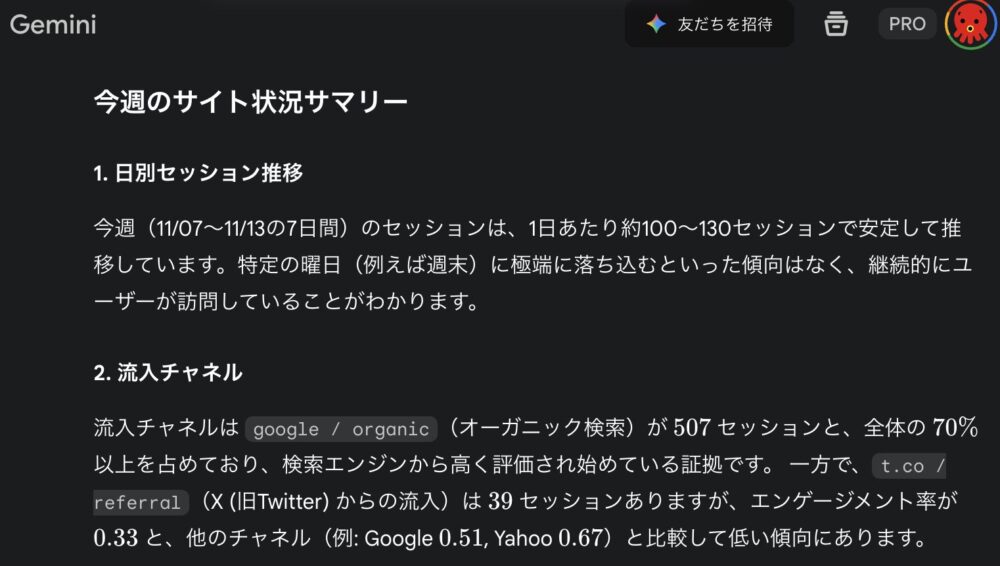 あなたはプロのWebアナリストです。GA4・Search ConsoleデータとサイトURLから、【今週】の傾向を分析し、特に改善すべき点を3つ挙げてください。