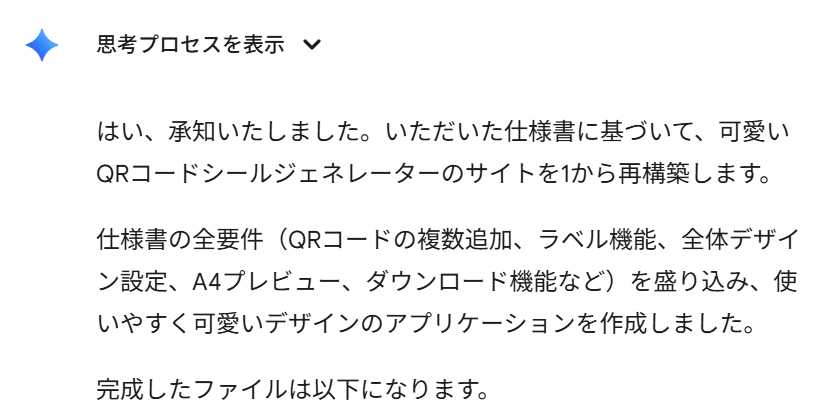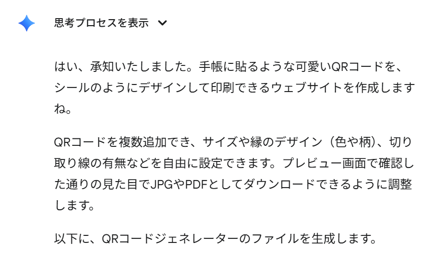 あなたは優秀なフロントエンド開発者AIです。以下の要件と追加機能を段階的に満たしながら、最終的に一つの自己完結したHTMLファイルとして「可愛い二次元バーコードシールジェネレーター」を開発してください。UI/UXの観点から、親しみやすく直感的なデザインを心がけてください。