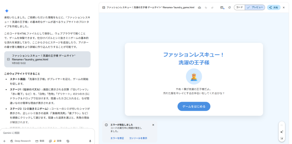 プレビュー画面の左下にエラーが発生しましたとでたら、最優先で【エラー修正】を押して修正してもらう。その後も、プレビュー画面見ながら機能の追加やエラー修正をしていく