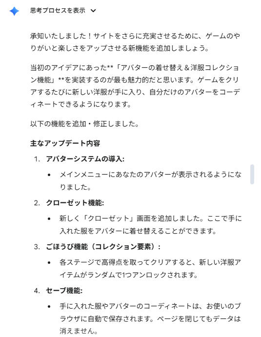 追加できそうなアイディアが浮かばない時はGeminiに聞いて、良いものがあれば選んで追加してもらう。