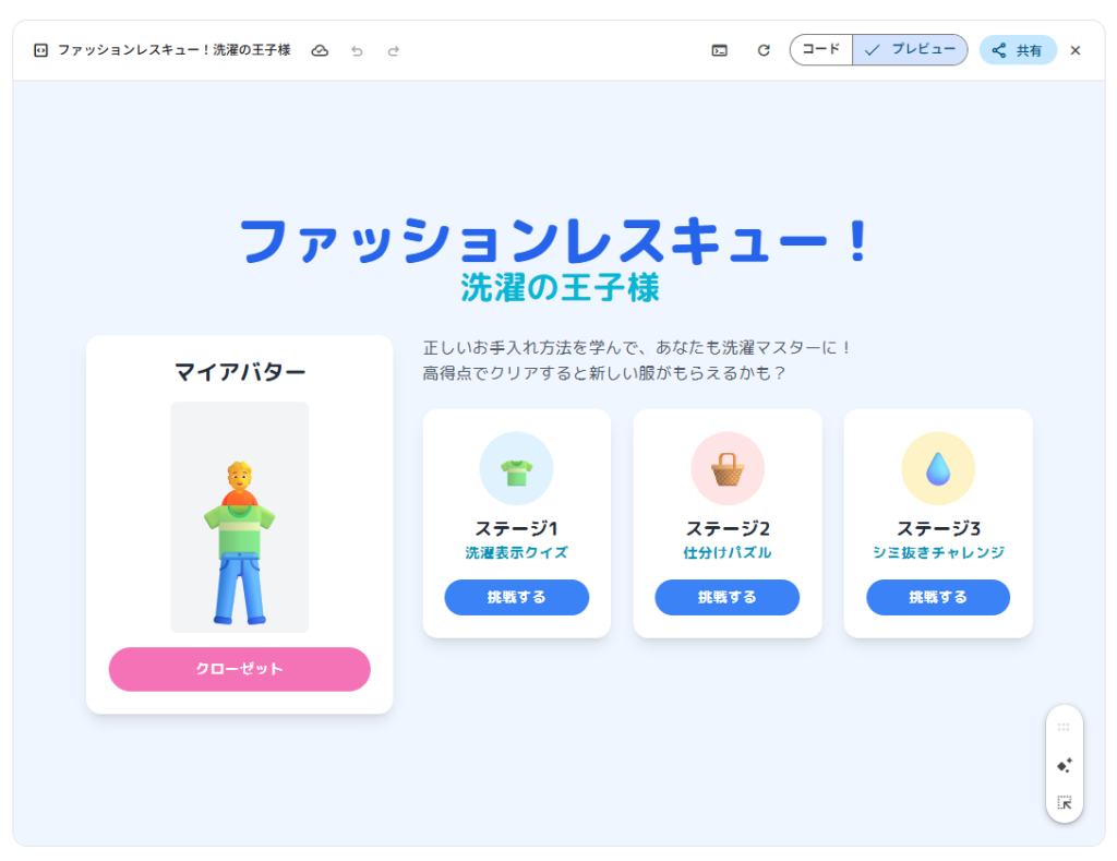 ユーザーが衣類の正しい手入れ方法を楽しく学べる、シミュレーションゲームのWebサイト「ファッションレスキュー!洗濯の王子様」を制作してください。