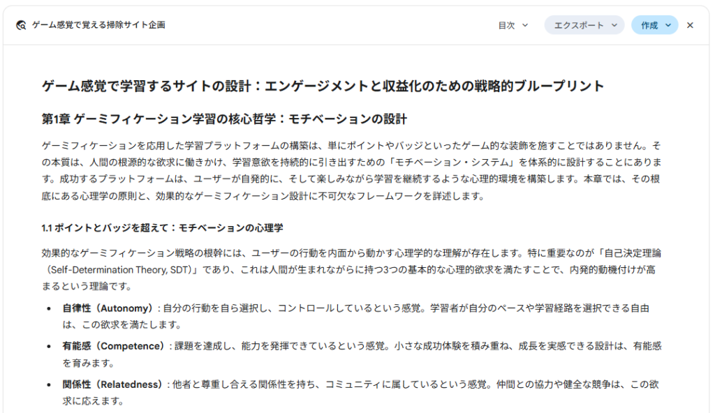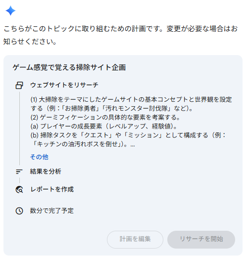お掃除の情報の次はそのままサイト作成に進んでも良かったんですが、Geminiが独断でゲームの企画書をまず書いてくれました。