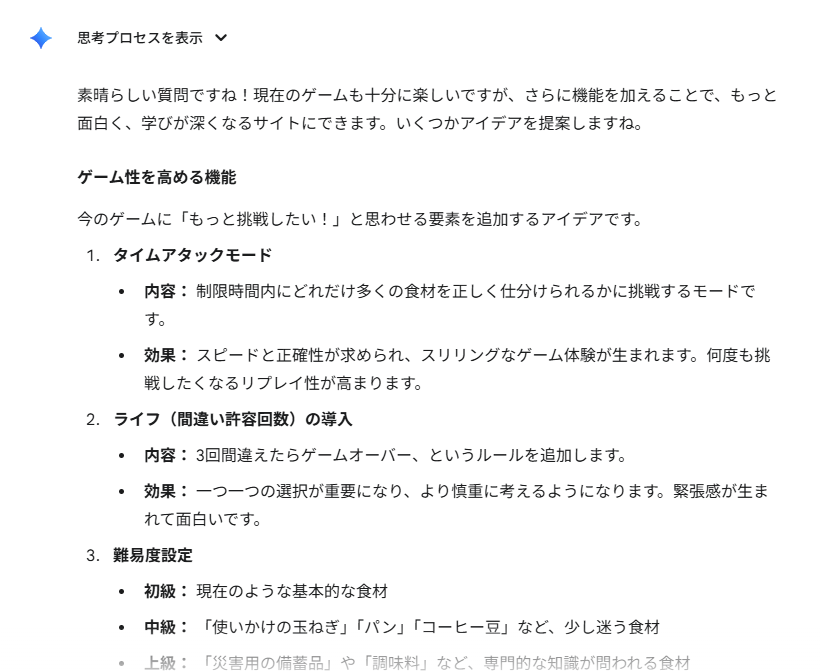 他にも追加したほうが良いアイディアはないかGeminiに聞いてみる