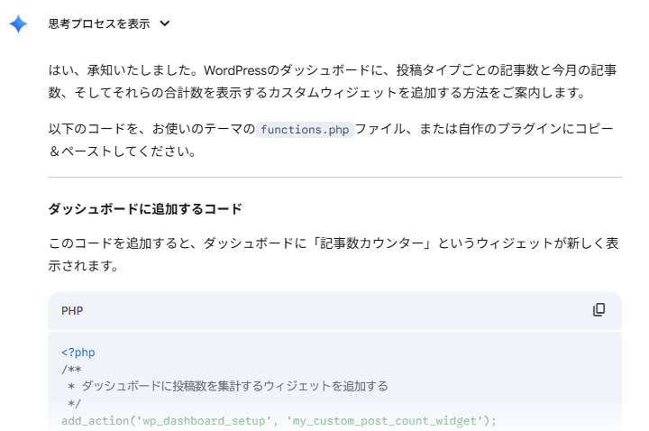 そこで、この作業を自動化できないかと思い、生成AIのGeminiに相談。WordPressのダッシュボードにオリジナルの「記事数カウンター」ウィジェットを追加してもらうことにしました。