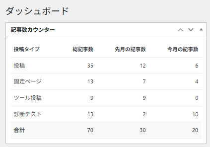 • 「記事数カウンター」というウィジェットが表示され、投稿・固定ページ・カスタム投稿タイプごとの記事数が集計されていれば成功です。