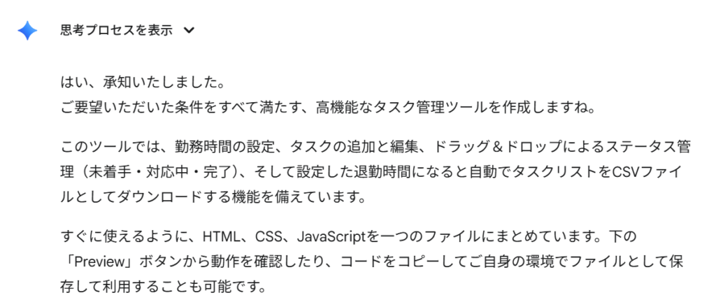 AIツール「Gemini Canvas」で作成した、タスクの作業時間を計測し、退勤時間に合わせて自動でCSVデータをダウンロードする、シンプルなタスク進行管理ツールの作り方を解説します。ブラウザで安全に使えるこのツールのHTMLとJavaScriptコードを公開。自分でツールを作って、タスク管理を効率化しましょう!