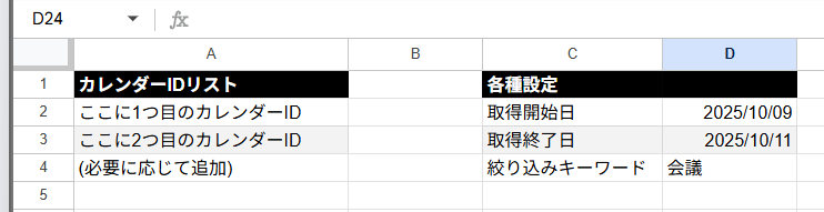 これだとカレンダーを4つ以上追加したときに【所得開始日】【所得終了日】【絞り込みキーワード】を下ずれ、GASのそれぞれの項目のセル指定をいちいち変更しなくてはいけません。いくつカレンダーを追加してもGASを修正しなくても良いようにレイアウトを修正してもらいました。