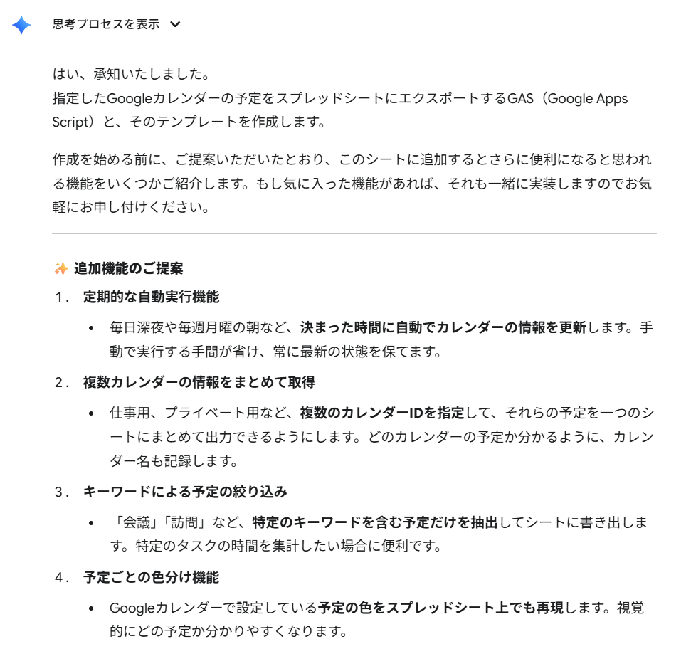 生成AIが提案してくれた追加機能から入れたい機能をピックアップ、いよいよテンプレートとGASを作成してもらいます。