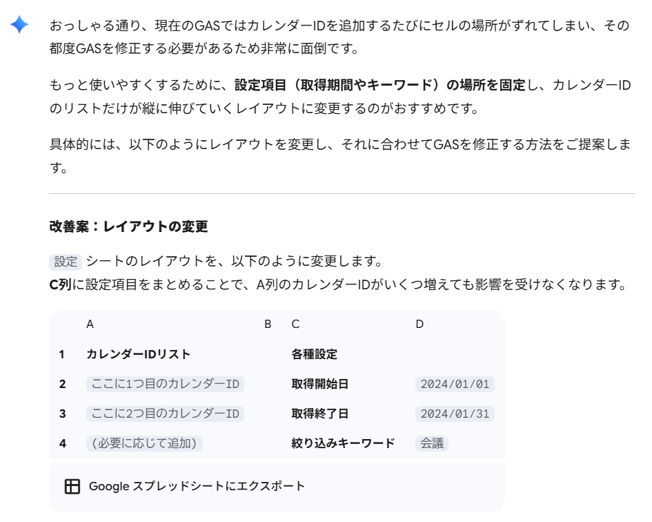 このGASだとcalendarIDが増えると取得開始日、取得終了日、絞り込みキーワードのセルの場所が変わってGASを修正しないといけなくなるから面倒くさい。いい方法ある?