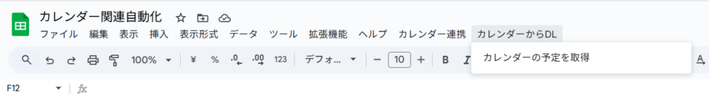 Scriptをペーストしたら【Ctrl+S】で保存、【Ctrl+R】でプログラムを実行すると。シートの右上に【カレンダーからDL】というメニューが表示されます。