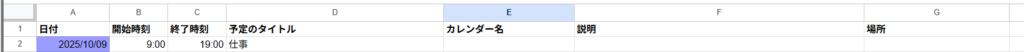 const headers = ['日付', '開始時刻', '終了時刻', '予定のタイトル', 'カレンダー名', '説明', '場所'];