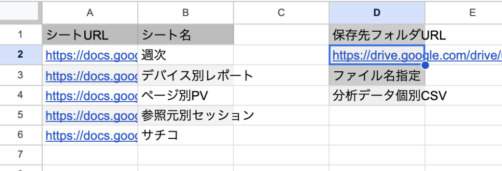 - A列:スプレッドシートURL