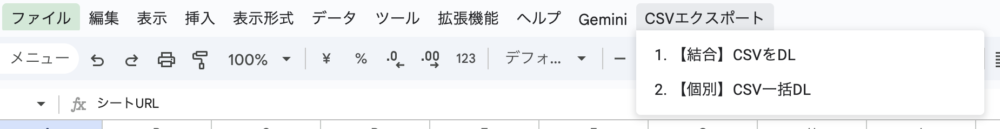 先ほどのシートを複製して、シート名を「【個別】CSV一括DL」に変更、新たに作成してもらったGASを設定して完成です。