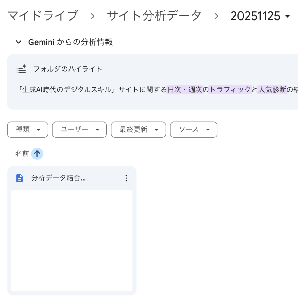 Googleドライブに保存してくれるみたいですね。最近ではGoogleドライブのツール自体にGeminiが搭載されているのでドライブにアップするだけで、データ分析や保存データの管理・要約が一気に容易になりそうで楽しみです。