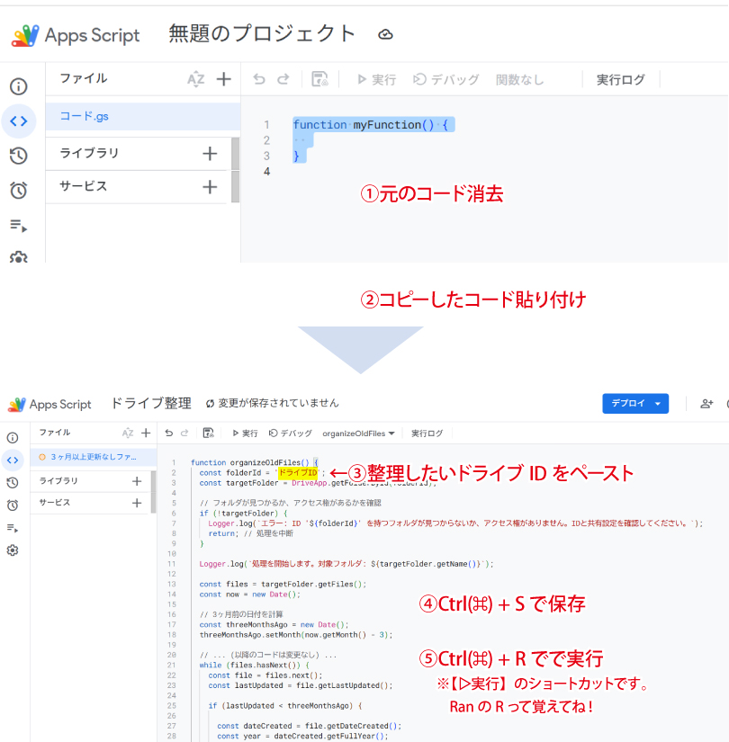 ※ドライブIDの場所に整理したいフォルダのドライブIDを指定してお使いください。