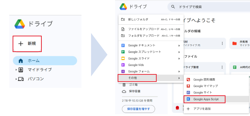 Googleドライブを開く→左上の【+新規】ボタン→その他→Google Apps Script