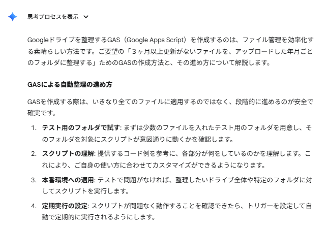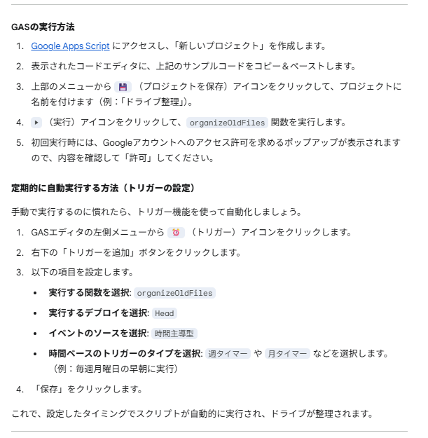 このようにフォルダ整理の進め方や注意点、GASコードの作成・実行方法まで、私の補足いらずで全て教えてくれます。(笑)あとは指示通り設定していくだけですが万が一、設定したあとにコードがエラーになったときはエラーの内容を生成AI教えてあげるとエラーの原因や解決策もおしえてくれます。